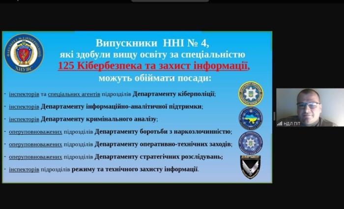 Завідувач науково-дослідної лабораторії з проблем інформаційних технологій та протидії злочинності у кіберпросторі ННІ №4 Дмитро Пашнєв провів чергову профорієнтаційну онлайн-зустріч із учнями випускних класів шкіл Харківської області та їх батьками, до якої підключилося понад 100 локацій. Завідувач НДЛ детально розповів про спеціальності університету, їх відмінності, працевлаштування у підрозділи Національної поліції після закінчення університету. Крім того, як провідний розробник системи відбору на навчання в заклади вищої освіти зі специфічними умовами навчання, що готують поліцейських, він провів інструктаж щодо заповнення анкети вступника, надав поради щодо вирішення проблем, які при цьому можуть виникнути.