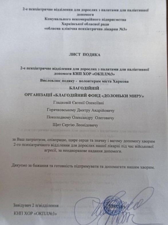 Провідна наукова співробітниця науково-дослідної лабораторії соціально-психологічного супроводу та реабілітації працівників МВС ННІ №3 Євгенія Гладкова разом із командою волонтерів Благодійного фонду «Долоньки миру» передали гуманітарну допомогу 2-му психіатричному відділенню для дорослих із палатами для паліативної допомоги КНП ХОР «Обласна клінічна психіатрична лікарня №3». Колектив лікарні подякував волонтерам за співпрацю, щире серце та неодноразову значну й вагому допомогу хворим.