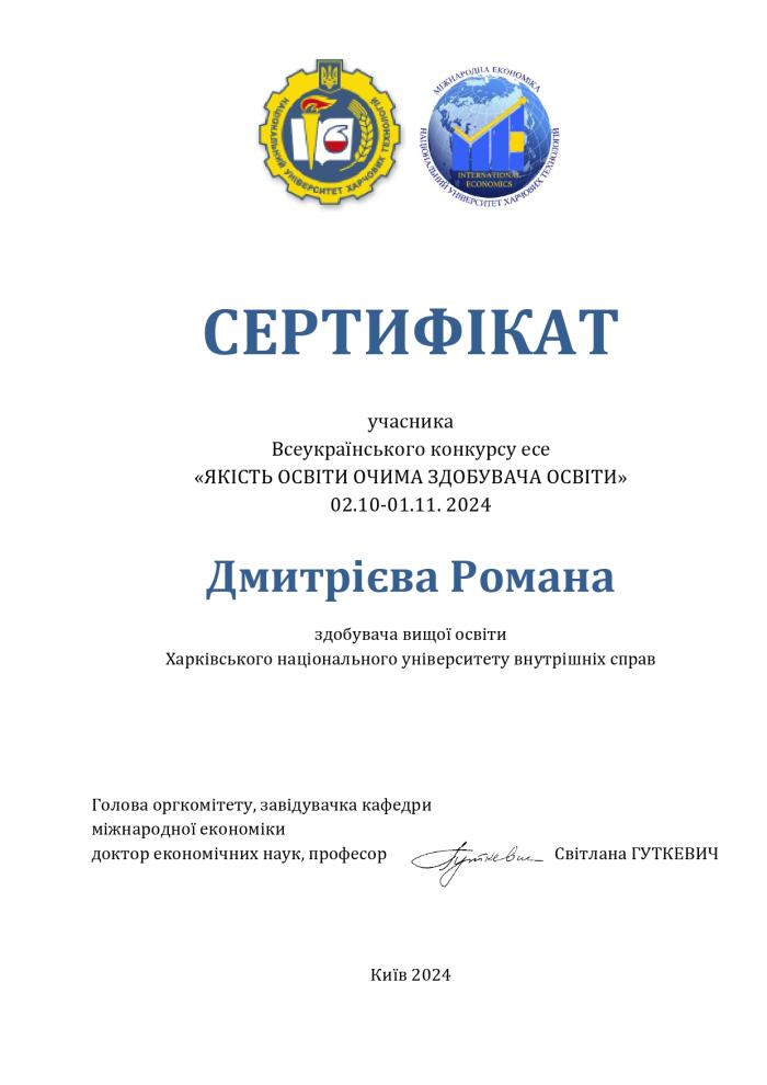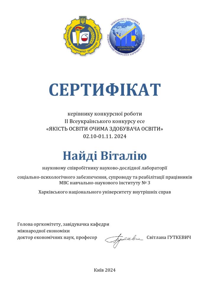 Курсант 2 курсу ННІ №3, який є учасником Школи наукового лідерства ХНУВС, Роман Дмитрієв підготував до ІІ Всеукраїнського конкурсу есе «Якість освіти очима здобувача освіти» роботу на тему «Питання академічної доброчесності: проблеми реалізації та порушення» (науковий керівник – науковий співробітник науково-дослідної лабораторії соціально-психологічного забезпечення, супроводу та реабілітації працівників МВС ННІ №3 Віталій Найда).