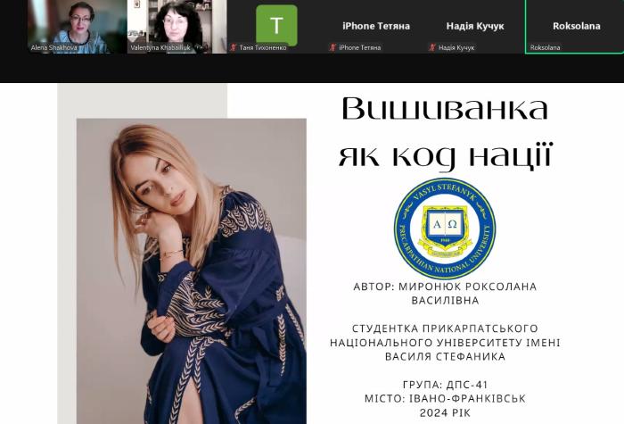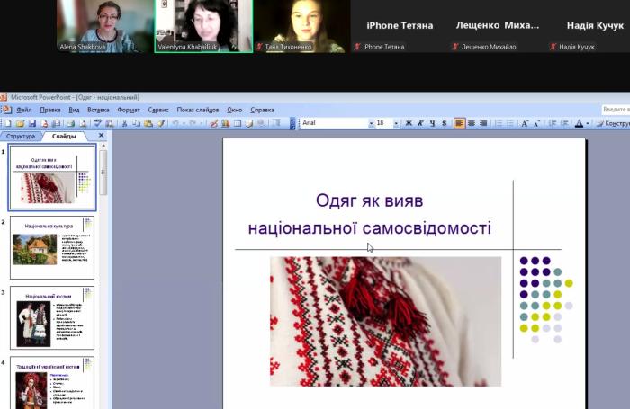 Учасники заслухали та обговорили три доповіді. Студентка групи ННІ №5 ХНУВС Тетяна Тихоненко виступила з доповіддю «Мода як засіб впливу та формування національної ідентичності», доцентка кафедри соціальної психології факультету психології Прикарпатського національного університету імені Василя Стефаника, кандидатка психологічних наук Валентина Хабайлюк розповіла про історію українського національного костюму в доповіді «Одяг як вияв національної самосвідомості», студентка факультету психології Прикарпатського національного університету імені Василя Стефаника Роксолана Миронюк у доповіді «Вишиванка як код нації» – про сучасні тенденції української національної моди.