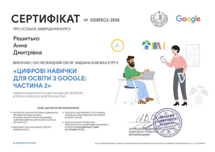 Науково-педагогічні працівники кафедри гуманітарних дисциплін Сумської філії ХНУВС Анна Решитько та Тетяна Пономаренко пройшли курс «Цифрові навички для освіти» від Google, метою якого – підвищення рівня цифрової грамотності освітян і практичне застосування сучасних цифрових інструментів, що сприяють інтерактивному та ефективному навчанню. Викладачі отримали знання з використання Google Workspace, навчилися застосовувати онлайн-інструменти для створення тестів, інтерактивних завдань і проєктів. Особливий акцент був зроблений на безпеці у мережі «Інтернет» та управлінні даними, що є важливою складовою цифрової освіти.