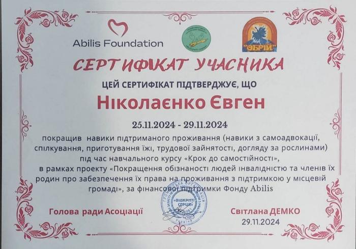 Старша викладачка кафедри конституційного і міжнародного права та прав людини ХНУВС Наталія Філіпська разом зі своїм сином Євгеном Ніколаєнком взяли участь у заході з підготовки менторів щодо організації підтриманого проживання для людей з інвалідністю у межах проєкту «Покращення обізнаності людей з інвалідністю та членів їхніх родин про забезпечення права на проживання з підтримкою у місцевій громаді». Цей захід об’єднав не лише освітні програми для батьків дітей з інвалідністю, а й заняття з основ самостійного проживання для самих осіб з інвалідністю – трудові навички, навички самообслуговування, приготування їжі тощо. Зустріч відбулася за ініціативи керівництва ГО «Асоціація захисту прав та допомоги людям з інвалідністю “Відкриті серця”».