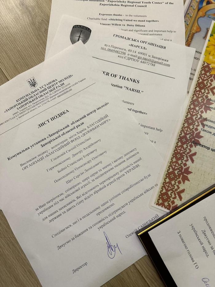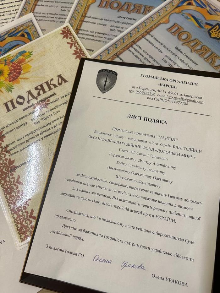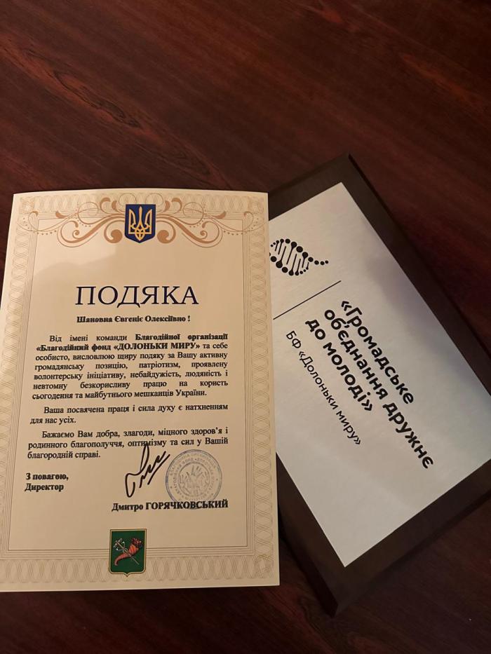 З нагоди Міжнародного дня волонтера провідна наукова співробітниця науково-дослідної лабораторії соціально-психологічного супроводу та реабілітації працівників МВС ННІ №3 ХНУВС Євгенія Гладкова, яка другий рік поспіль є волонтером фонду, була відзначена Подякою від директора Благодійної організації «Благодійний фонд «Долоньки миру»» Дмитра Горячковського за активну громадянську позицію, патріотизм, проявлену волонтерську ініціативу, небайдужість, людяність і невтомну безкорисну працю заради майбутнього України. Разом до перемоги!