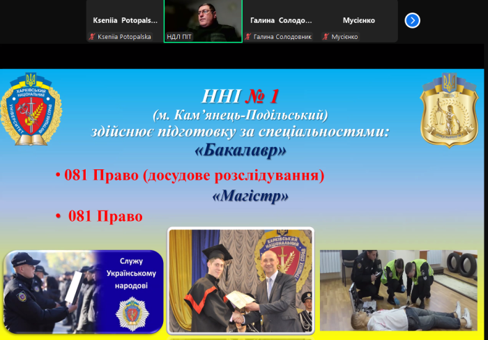 Онлайн-зустріч із учнями випускних класів шкіл Харківської області та їх батьками провів провідний науковий співробітник науково-дослідної лабораторії з проблем інформаційних технологій та протидії злочинності у кіберпросторі ННІ №4 Євген Грінченко. Він розповів школярам про Харківський національний університет внутрішніх справ, спеціальності та спеціалізації, за якими готують фахівців для підрозділів Національної поліції. Окремо він зупинився на навчально-науковому інституті №4, що має багаторічний досвід підготовки правоохоронців, які володіють спеціальними знаннями та навичками у сфері високих інформаційних технологій. Євген Грінченко звернув увагу учнів на переваги навчання в університеті: високий рівень професійної підготовки та досвіду науково-педагогічного складу, сучасну матеріально-технічну базу, комфортні умови проживання, престиж майбутньої професії, соціальний захист і гарантоване працевлаштування після завершення навчання.
