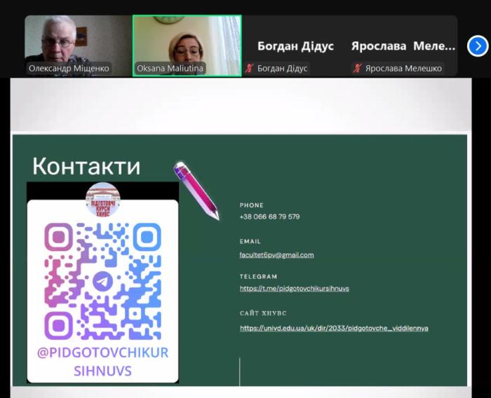 Завідувач підготовчого відділення Оксана Малютіна ознайомила учасників заходу з умовами вступу до університету, його матеріальною базою та особливостями навчання у ННІ № 5, зокрема, розповіла про організацію навчання слухачів на підготовчих курсах. Вона також повідомила, що абітурієнтів готують до вступу у ЗВО з навчальних предметів «Історія України», «Українська мова та література», «Математика» та «Англійська мова», до викладання яких залучені кращі науковці та викладачі.