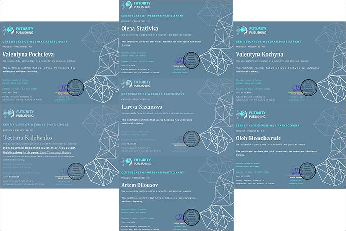 Викладачі кафедри отримали інформацію про значення наукових публікацій та основні виклики для дослідників, про ризики неправильного вибору видання та загрози публікацій у шахрайських журналах, про ознаки шахрайських і хижацьких видань та методи їх уникнення. Рекомендації, надані досвідченим фахівцем, стануть у нагоді науковцям кафедри під час підготовки статей та вибору видань у Scopus. Учасники заходу отримали по два сертифікати: за активну участь у заході (прослуховування вебінару, лекцій, виконання практичних завдань) та за успішне проходження тестування.