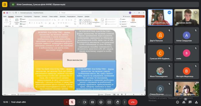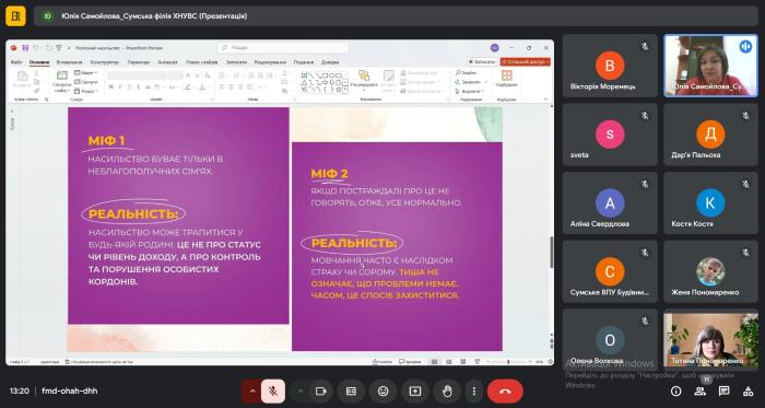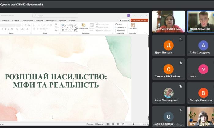 У межах проведення Всеукраїнської акції «16 днів проти насильства» для здобувачів освіти ДНЗ «Сумське вище професійне училище будівництва та автотранспорту» та учнів КУ «Сумська ЗОШ №24» інформаційний захід провели професорка кафедри гуманітарних дисциплін Сумської філії ХНУВС Юлія Самойлова та інспектор сектору ювенальної превенції Сумського РУП ГУНП у Сумській області Даніїл Михайлик.