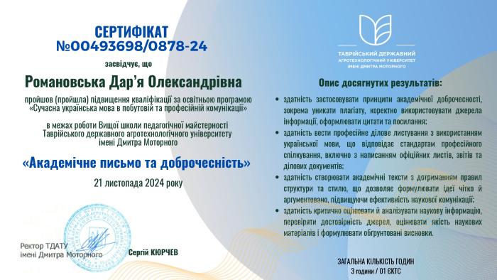 Дар’я Романовська взяла участь в онлайн-практикумі «Академічне письмо та доброчесність», де спікери розглянули питання застосування штучного інтелекту в освітньому процесі та науковій діяльності, дотримання академічної доброчесності під час запозичення ідей. Слухачі також попрактикувалися в написанні якісних професійних текстів, розглянули найпоширеніші мовні помилки, редагували мовні кліше.