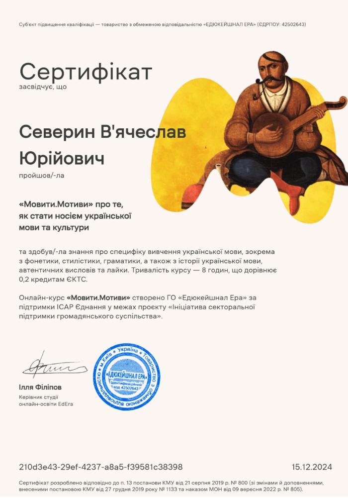 Під керівництвом доцентки кафедри гуманітарних дисциплін та українознавства, кандидатки філологічних наук Наталії Кобилко першокурсники ННІ №5 взяли участь у декількох заходах підвищення кваліфікації. В’ячеслав Северин і Владислав Сімоненко опанували онлайн-курс «Мовити.Мотиви», спрямований на поглиблення знань із фонетики, стилістики, граматики, історії української мови та удосконалення вмінь послуговуватися мовними засобами залежно від комунікативної ситуації. Протягом курсу здобувачі освіти занурилися в українську культуру, літературу та кінематограф, що робило процес навчання цікавим та інтерактивним.