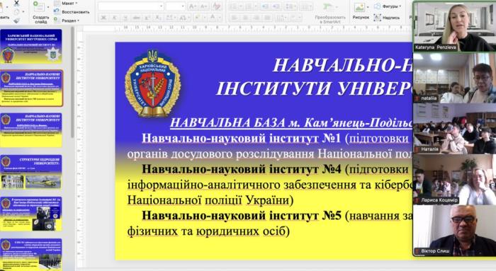Старша викладачка кафедри криміналістики та судової експертології ННІ №1 Катерина Пензєва під час онлайн-зустріч зі старшокласниками Кам’янець-Подільського ліцею №17 розповіла про навчально-наукові інститути та спеціальності, за якими готують фахівців у Харківському національному університеті внутрішніх справ, про умови навчання, побуту та дозвілля курсантів і студентів ХНУВС. Викладачка звернула увагу ліцеїстів на перспективи подальшого працевлаштування та кар’єрні можливості для випускників Харківського поліцейського університету, ознайомила з інформацією щодо реєстрації кандидатів на вступ до ХНУВС через портал https://osvita.np.gov.ua.