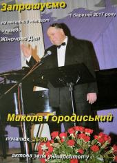 1 березня 2017 року о 15:00 в актовій залі Харківського національного університету внутрішніх справ відбудеться весняний концерт фахівця відділу соціально-гуманітарної роботи університету Миколи Городиського з нагоди Міжнародного жіночого дня.