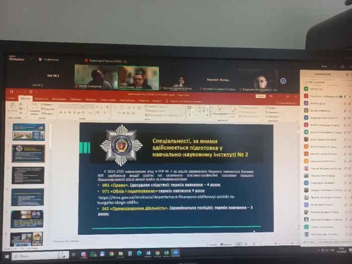 Заступник директора з освітньої та науково-дослідної діяльності ННІ №2 Сергій Гіренко ознайомив учнів 11-х класів з особливостями та специфічними умовами вступу до Харківського національного університету внутрішніх справ у 2025 році. Він продемонстрував презентацію про ХНУВС та навчально-науковий інститут №2, розповів про спеціальності та освітні програми, за якими готують курсантів і студентів, підкреслив основні переваги навчання в університеті та перспективи подальшого працевлаштування.