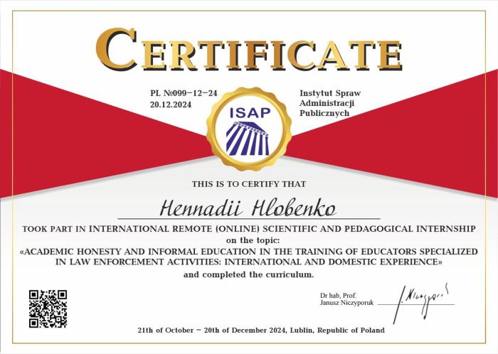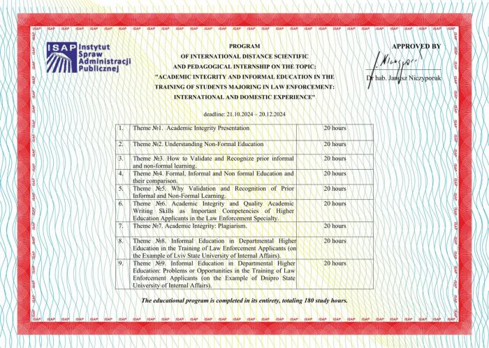 Професори кафедри кримінального процесу та організації досудового слідства ННІ №1 Геннадій Глобенко та Олена Мартовицька пройшли Міжнародне дистанційне науково-педагогічне стажування на тему: «Академічна доброчесність та неформальна освіта у підготовці здобувачів освіти спеціальності «Правоохоронна діяльність»: міжнародний та вітчизняний досвід» з навчальним навантаженням 6 кредитів ECТS (180 годин). Захід запроваджений ISAP Instytut Spraw Administracji Publiczney (Інститут державного управління ISAP) м. Люблін (Республіка Польща) та ГО «Міжнародна фундація науковців та освітян». Програма розроблена для науково-педагогічних працівників закладів вищої освіти, вищих військових навчальних закладів, освітян ліцеїв, гімназій, а також здобувачів освіти спеціальності «Правоохоронна діяльність» для підвищення рівня професійної компетенції та удосконалення своїх знань щодо запропонованої теми стажування.