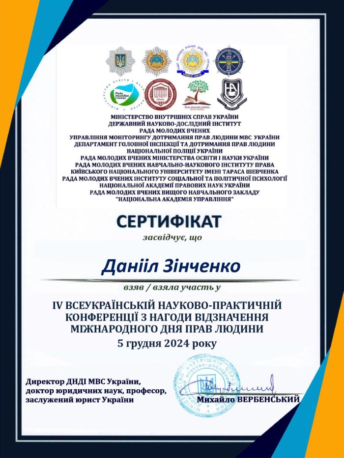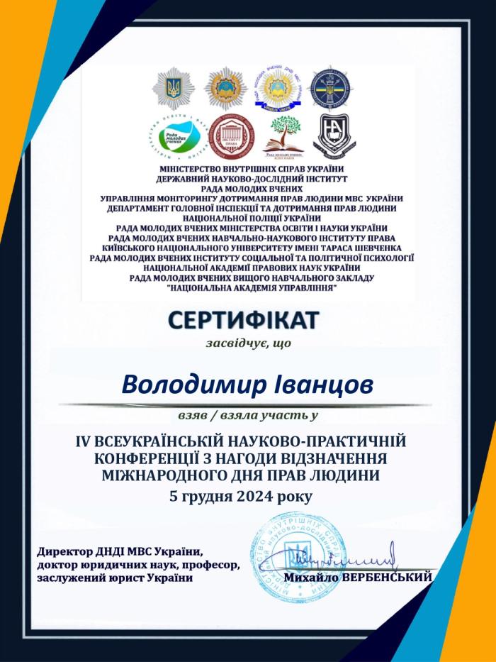 У IV Всеукраїнській науково-практичній конференції, присвяченій актуальним питанням захисту прав і свобод людини в сучасному світі, взяли участь начальник відділу аспірантури (ад'юнктури) і докторантури, професор кафедри адміністративної діяльності, кандидат юридичних наук, доцент Володимир Іванцов та ад'юнкт цього ж відділу Данііл Зінченко.