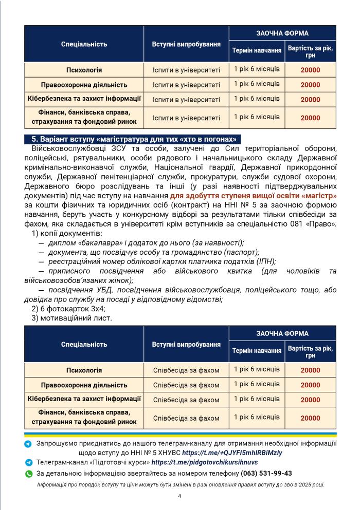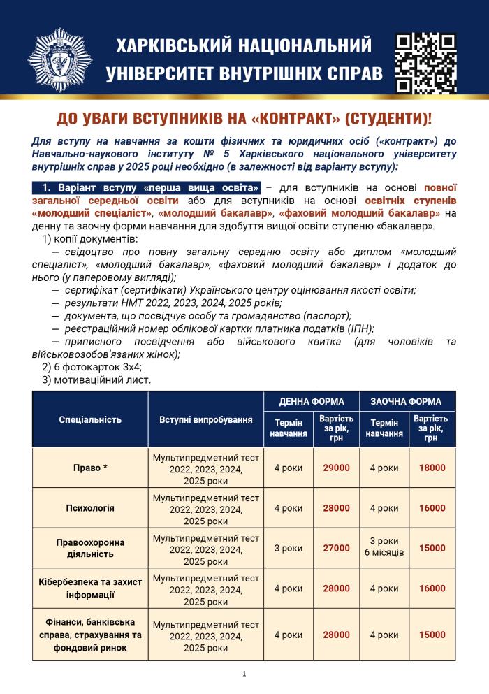 Юнаки та дівчата, у вас є час підготуватися до вступу до навчально-наукового інституту №5 Харківського національного університету внутрішніх справ на навчання за кошти фізичних та юридичних осіб («контракт»). Студенти, які навчаються в ННІ №5, опановують професії юриста, фахівця у галузі правоохоронної діяльності, професіонала з кібербезпеки та захисту інформації, психолога, спеціаліста у сфері банківських справ, фінансів, страхування та фондового ринку.
