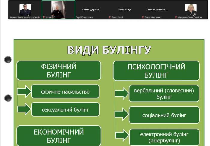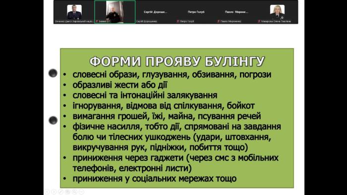 Представники Харківського національного університету внутрішніх справ і громадських організацій Дніпропетровщини та Харківщини взяли участь в онлайн-зустрічі на тему «Роль служби освітньої безпеки Національної поліції у протидії та запобіганні булінгу у закладах освіти». Захід організували начальник відділу аспірантури (ад'юнктури) і докторантури, професор кафедри адміністративної діяльності, кандидат юридичних наук, доцент Володимир Іванцов, ад'юнкт цього ж відділу Данііл Зінченко спільно з ГО «Молодіжна організація починаючих лідерів».