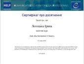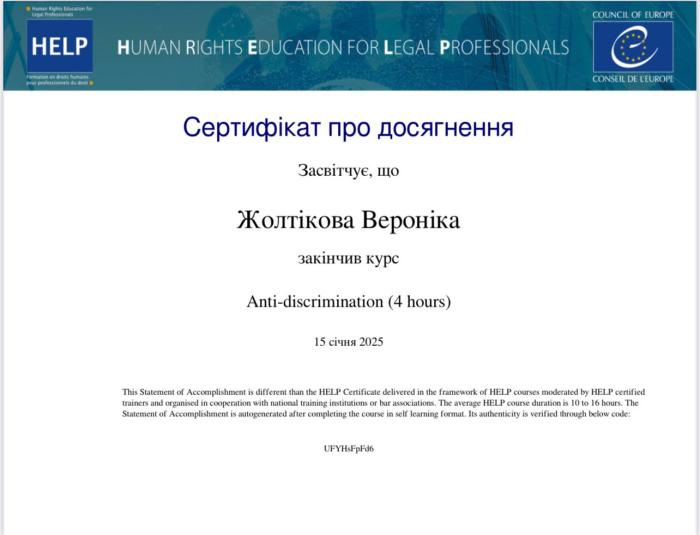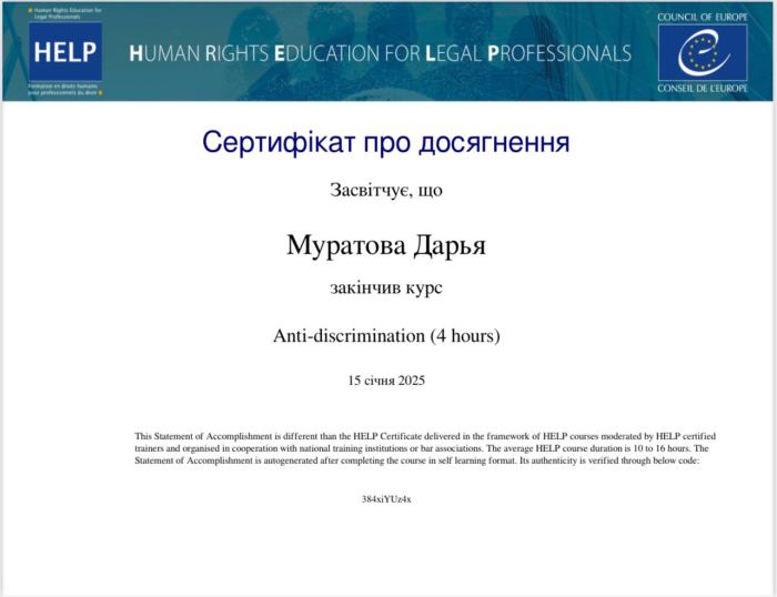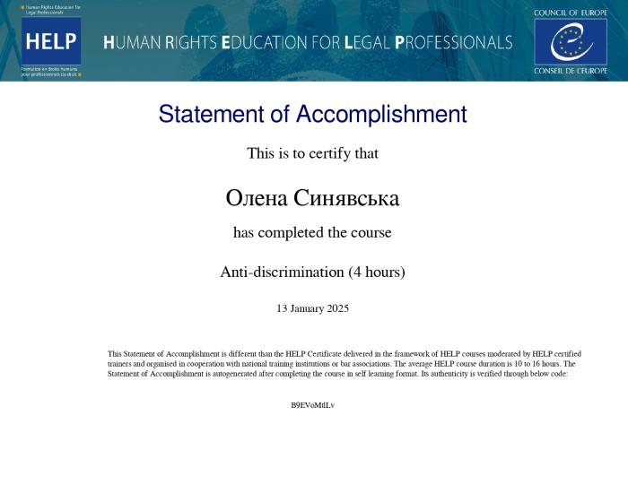 Гарант освітньо-професійної програми першого (бакалаврського) рівня вищої освіти, галузь знань 26 «Цивільна безпека», спеціальність 262 «Правоохоронна діяльність» (правоохоронна діяльність), професорка кафедри правоохоронної діяльності ННІ №5 Олена Синявська та доцентка цієї ж кафедри Дар’я Глушкова разом зі студентками Іриною Лотоцькою, Веронікою Жолтіковою, Дар’єю Муратовою, які здобувають вищу освіту за освітньою програмою першого (бакалаврського) рівня вищої освіти «Правоохоронна діяльність», успішно пройшли курс «Anti-discrimination» від Ради Європи. Курс, який розроблено спеціально для юристів, складається з чотирьох модулів: «Дискримінація щодо осіб з інвалідністю», «Дискримінація за ознакою раси, релігійної приналежності та ін.», «Дискримінація за ознаками сексуальної орієнтації та гендерної ідентичності» та «Дискримінація по відношенню до ромів». Курс містить багато покликань на сучасне законодавство й прецедентне право ЄС і Ради Європи.