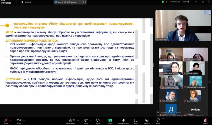 Керівниця Департаменту антикорупційної політики Тетяна Гетьманцева та головний спеціаліст Євгеній Прейс презентували громадськості законопроєкт, наголосивши на важливості запровадження Інформаційної системи обліку відомостей про адміністративні правопорушення, пов’язані з корупцією.