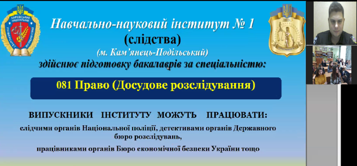 Доцент кафедри кримінального права і кримінології ННІ №1 Олександр Авдєєв у режимі відеоконференції провів зустріч зі старшокласниками Звенячинського закладу загальної середньої освіти І-ІІІ ступенів Чернівецької області. Він приділив увагу якості підготовки курсантів у Харківському національному університеті внутрішніх справ та особливостям вступної кампанії у 2025 році. Олександр Авдєєв розповів майбутнім вступникам про спеціальності, за якими готують фахівців у ХНУВС, про можливості реалізуватися у науковій, творчій і спортивній діяльності, ознайомив із перспективами подальшого працевлаштування випускників університету. Він також роз’яснив, як заповнити анкету кандидата на навчання на порталі https://osvita.np.gov.ua/.