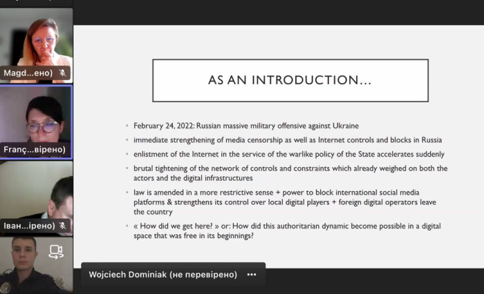 Учасників привітав проректор з міжнародних питань Університету імені Адама Міцкевича у Познані Рафал Вітковський, який висловив слова підтримки українським учасникам лекції та представив лекторку Франсуазу Доке, яка є професоркою Школи вищих досліджень соціальних наук (EHESS) у Парижі. Вона виступила з доповіддю «Як створити мережу авторитаризму в росії? Рунет між репресіями та наглядом у воєнний час».