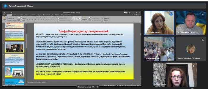 Заступниця директора ННІ №5 Елла Твердохліб, доцент кафедри правового забезпечення підприємницької діяльності та фінансової безпеки Артем Подорожній, старша викладачка цієї ж кафедри Ірина Антол провели профорієнтаційну зустріч на тему вступної кампанії 2025 року.