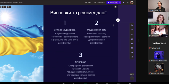 Студенти підготували доповіді, у яких проаналізували реальні кейси боротьби з дезінформацією. Учасники обговорили необхідність посилення ролі громадськості в інформаційній боротьбі, адже саме активні громадяни є першою лінією захисту від дезінформації. Також було запропоновано розробити комплексні освітні програми для підвищення рівня медіаграмотності серед різних вікових груп населення. Наприкінці засідання учасники дійшли висновку, що українські медіа відіграють важливу роль у формуванні інформаційного фронту проти російської агресії. Вони не лише забезпечують достовірність даних, але й сприяють міжнародній підтримці України. Для подальшого зміцнення інформаційної безпеки необхідно продовжувати вдосконалювати правові механізми, підтримувати незалежні медіа та активізувати інформаційно-просвітницьку роботу серед громадян.