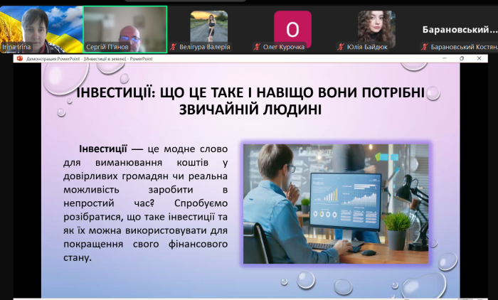 Доцентка кафедри правового забезпечення підприємницької діяльності та фінансової безпеки ННІ №5 Ірина КИРЄЄВА спільно з заступником директора з інвестиційної політики Об’єднання промисловців і підприємців Харківської області Української спілки промисловців і підприємців Сергієм П’ЯНОВИМ провели для студентів четвертого курсу бінарне заняття за темою «Інвестиції в землю в Україні: можливості, ризики та перспективи». Йшлося про сучасний стан ринку землі в Україні після запуску земельної реформи 2021 року. Учасники обговорили також основні аспекти інвестицій у землю, зокрема переваги українських чорноземів, їх відносно низьку вартість і перспективи для агробізнесу, аналіз ризиків, пов’язаних із юридичною невизначеністю, політичною нестабільністю, інфраструктурними проблемами та екологічними викликами. Студенти активно ставили запитання та ділилися власними ідеями щодо інвестиційного потенціалу ринку землі в Україні.