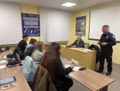 Василь ПІДГОРНЯК розповів про призначення, правове забезпечення, основні завдання та функції чергової частини, вимоги до її співробітників, обов’язки інспектора-чергового та організацію служби добового наряду. Він акцентував увагу на особливостях несення служби правоохоронців у чергових частинах органів поліції під час дії правового режиму воєнного стану. Поліцейський також ознайомив студентів із діяльністю операторів служби «102» (ІТНП «Цунамі»), працівники якої у цілодобовому режимі приймають і реєструють повідомлення про правопорушення та інші події за допомогою автоматизованого робочого місця оператора лінії «102». Окремо звернув увагу молоді на значенні оперативного реагування поліції на випадки правопорушень, звернення громадян, поставлення завдань нарядам поліції.