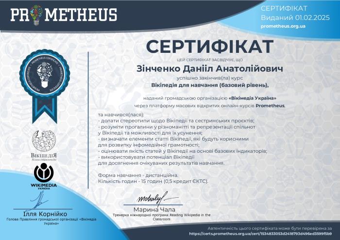 Начальник відділу аспірантури (ад’юнктури) і докторантури, професор кафедри адміністративної діяльності, кандидат юридичних наук Володимир ІВАНЦОВ та ад’юнкт цього ж відділу Данііл ЗІНЧЕНКО успішно завершили курс «Вікіпедія для навчання (базовий рівень)», організований ГО «Вікімедіа Україна».