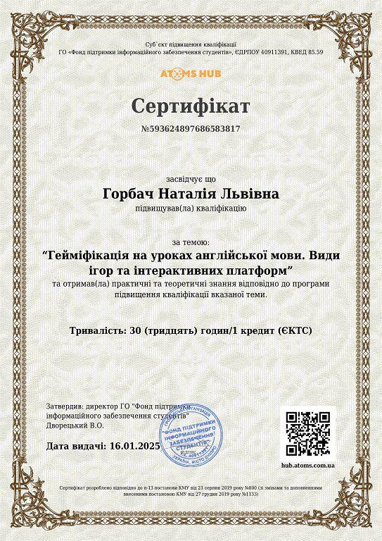 Старша викладачка кафедри мовної підготовки ХНУВС Наталія ГОРБАЧ пройшла підвищення кваліфікації науково-педагогічних працівників. Вона успішно засвоїла програму «Гейміфікація на уроках англійської мови. Види ігор та інтерактивних платформ», ознайомилася з поняттям та технологією гейміфікації освітнього процесу, особливостями процесу запровадження та реалізації цікавих методів і технік у роботі. Отримані знання будуть використані у професійній діяльності.