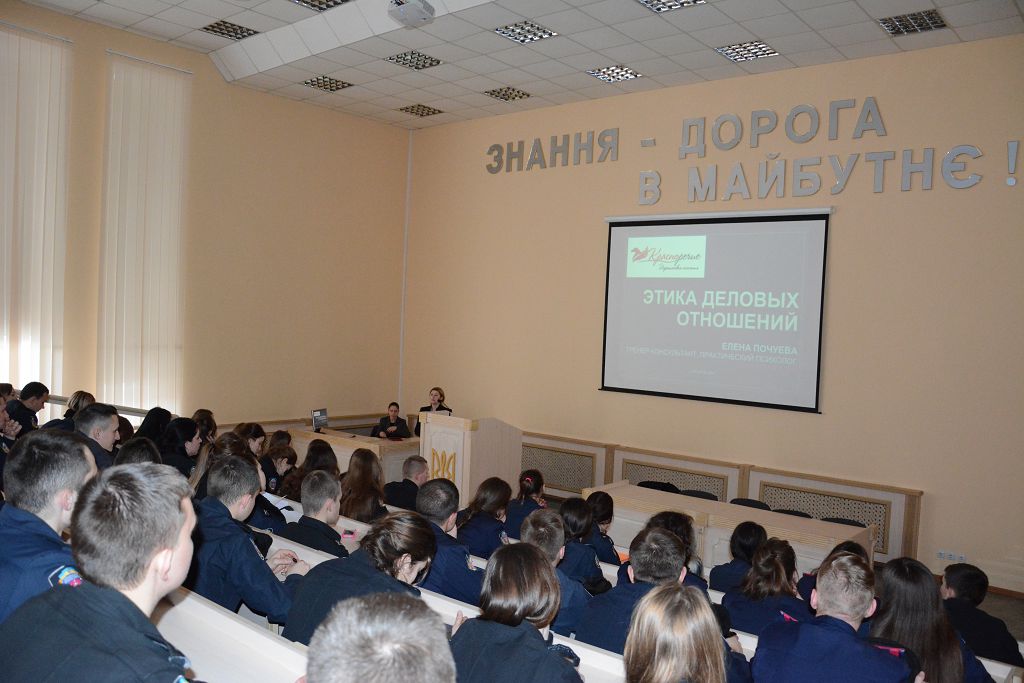 У рамках роботи Університету культури в Харківському національному університеті внутрішніх справ відбувся відеолекторій за участю голови тренінгової компанії «Красномовство» Олени Почуєвої. Тема лекції – «Етика ділового спілкування».