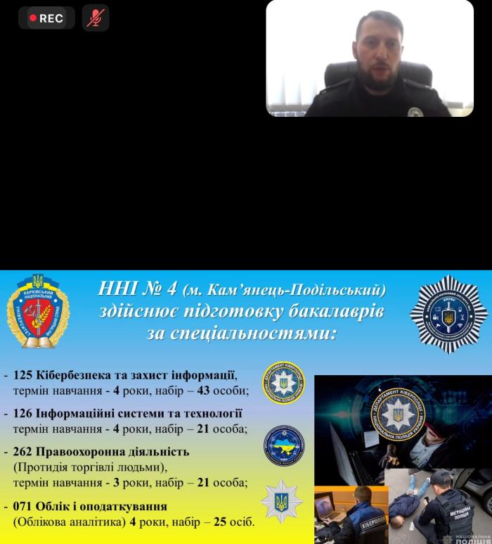 У межах профорієнтаційної роботи заступник директора з освітньої та науково-дослідної діяльності ННІ №4 Юрій ОНИЩЕНКО ознайомив учнів випускних класів зі спеціальностями, за якими готують фахівців для підрозділів Національної поліції. Він розповів про переваги навчання у закладі вищої освіти, перспективи професії поліцейського та унікальні можливості здобуття спеціалізованої освіти з кібербезпеки. Особливу увагу було приділено поєднанню теоретичних знань із практичними навичками, необхідними для ефективної боротьби з кіберзагрозами. Під час зустрічі також обговорювалися правила інтернет-безпеки, етика в цифровому просторі та питання кібергігієни, які стали особливо актуальними в умовах війни.