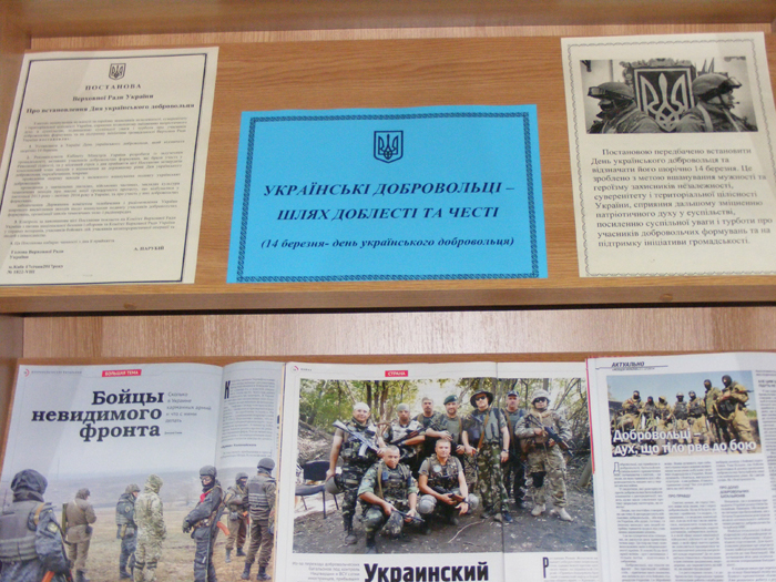 Бібліотека Харківського національного університету внутрішніх справ презентує університетській спільноті книжково-ілюстративну експозицію, приурочену до Дня українського добровольця, який вперше в Україні відзначається 14 березня. Експозиція розповідає про звичайних хлопців та дівчат, які, не зважаючи на смертельну загрозу, в небезпечний час стали на захист незалежності, суверенітету та територіальної цілісності України.