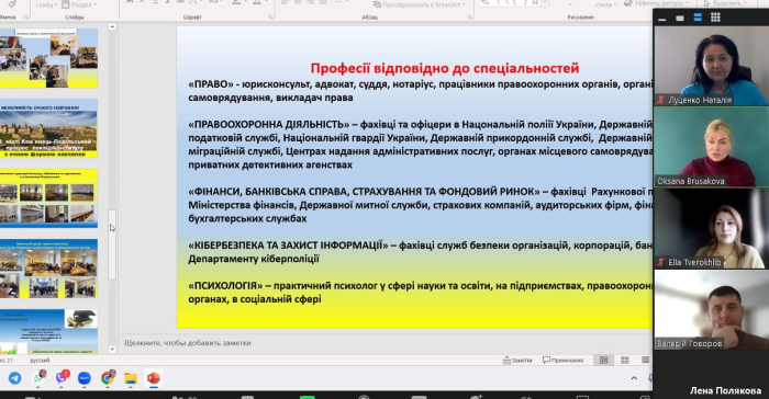 Доценти кафедри Валерій ГОВОРОВ і Дар’я ГЛУШКОВА за участі директорки ННІ №5 Оксани БРУСАКОВОЇ та її заступниці Елли ТВЕРДОХЛІБ провели онлайн-зустріч на тему вступної компанії 2025 року з керівництвом і слухачами випускних курсів КЗОЗ «Купʼянський медичний фаховий коледж імені Марії Шкарлетової» Харківської обласної ради.