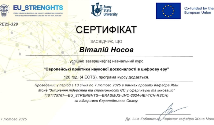Представники кафедри протидії кіберзлочинності ННІ №4 – завідувач Олександр МАНЖАЙ та професор Віталій НОСОВ успішно завершили онлайн-курс «Європейські практики наукової досконалості в цифрову еру» (4 ECTS), організований у межах виконання проєкту Кафедра Жана Моне «Зміцнення лідерства та спроможності ЄС у сфері науки та інновацій» (101175767—EU_STRENGHTS—ERASMUS-JMO-2024-HEI-TCH-RSCH) 2024-2027. Проєкт реалізується кафедрою економіки, підприємництва та бізнес-адміністрування Сумського державного університету під керівництвом кандидатки економічних наук, доцентки Інни КОБЛЯНСЬКОЇ.
