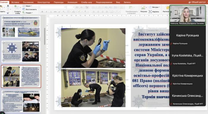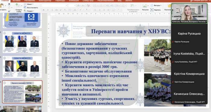 Cтарша викладачка кафедри криміналістики та судової експертології ННІ №1 Катерина ПЕНЗЄВА у межах профорієнтаційної роботи провела онлайн-зустріч із учнями випускних класів Кам’янець-Подільського ліцею №7 та ознайомила їх зі спеціальностями, за якими ХНУВС готує фахівців для підрозділів Національної поліції. Особливу увагу викладачка приділила особливостям підготовки кадрів для органів досудового розслідування. Вона розповіла майбутнім абітурієнтам про освітній потенціал університету, умови навчання та дозвілля курсантів, можливості для розвитку здобувачів освіти в науці, творчості та спорті, а також про переваги працевлаштування та кар'єрного росту після закінчення університету. Викладачка також надала інформацію щодо необхідності електронної реєстрації на вступ до закладу вищої освіти на порталі НПУ https://osvita.np.gov.ua/.