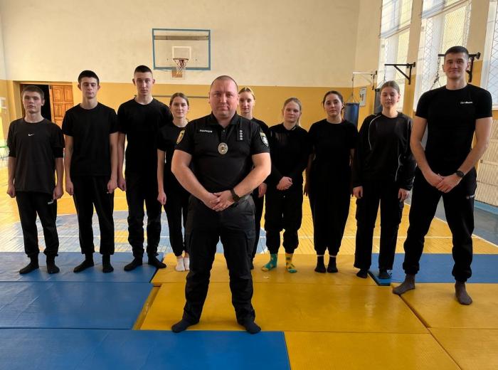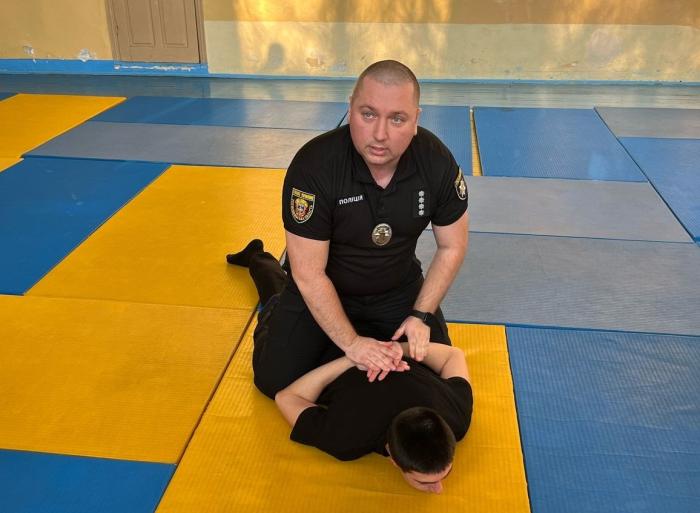 Викладач кафедри спеціальної фізичної підготовки ННІ №2 Олександр ШЕПЕЛЕВ і старший дільничний 4-го відділення поліції Тернопільського РУП ГУНП у Тернопільській області Дмитро МІНЬКО разом із курсантами ННІ №4 детально розібрали способи затримання правопорушника під час підходу спереду із загином руки за спину («ривком», «замком», «нирком»), виконання повалень супротивника, дестабілізацію голови тощо. Опрацювали також техніку надягання кайданок і проведення поверхневої перевірки особи після застосування фізичного впливу (сили).