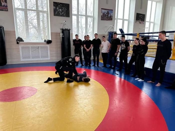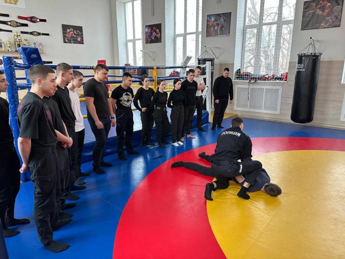 За такою темою бінарне заняття для курсантів 3 курсу ННІ №4 із дисципліни «Спеціальна фізична підготовка» провели доцент кафедри спеціальної фізичної підготовки ННІ №2 Богдан ЛУКІН і викладач цієї ж кафедри Роман ПАВЛОВ спільно з поліцейським взводу 1-ї роти 1 БПП з обслуговування Кам’янець-Подільського району Управління патрульної поліції Хмельницької області Департаменту патрульної поліції Євгеном ПАЗЮКОМ. Під час заняття були відпрацьовані практичні питання: захист від ударів руками й ногами; захист від обхоплень, захоплень; виконання спеціальних прийомів боротьби.