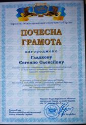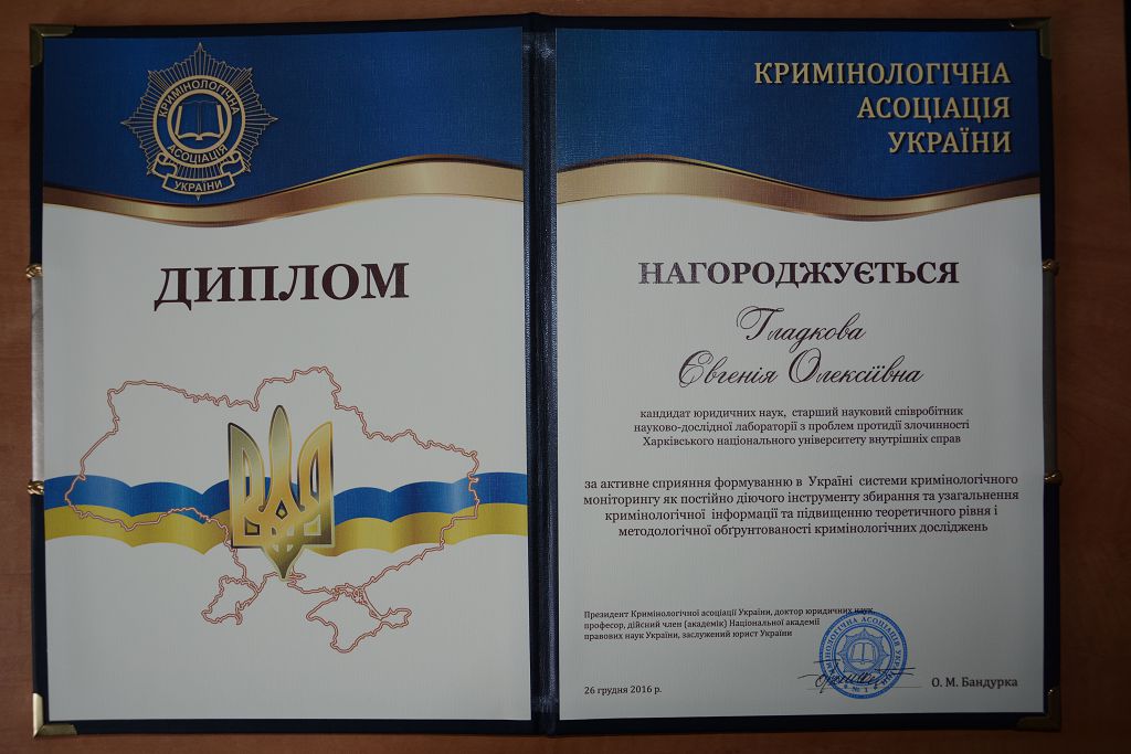 Під час засідання ректорату Харківського національного університету внутрішніх справ ректор університету генерал поліції третього рангу Валерій Сокуренко вручив старшому науковому співробітнику науково-дослідної лабораторії з проблем протидії злочинності, кандидату юридичних наук Євгенії Гладковій диплом Кримінологічної асоціації України за активне сприяння формуванню в Україні системи кримінологічного моніторингу як постійно діючого інструменту збирання та узагальнення кримінологічної інформації та підвищенню теоретичного рівня і методологічної обґрунтованості кримінологічних досліджень, а також Почесну грамоту Союзу юристів України за активну роботу в Союзі юристів України та вагомий внесок у розбудову правової держави, зміцнення законності і правопорядку.