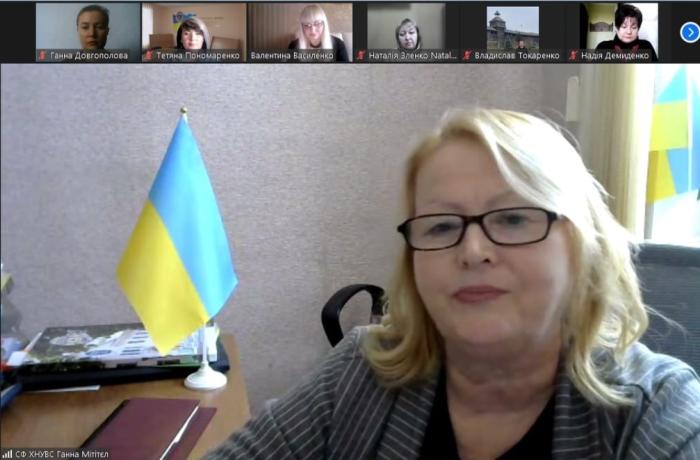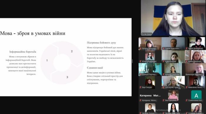 Здобувачка освіти 2 курсу спеціальності 262 «Правоохоронна діяльність» Дар’я КУЛАК виступила з доповіддю про консолідуючу роль мови у волонтерських ініціативах.