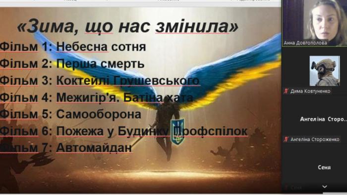 Курсанти переглянули документальні відеоматеріали, зокрема фрагменти циклу документальних фільмів «Зима, що нас змінила». Згадали подвиги звичайних людей, які стали символами незламності духу. Перегляд фільмів допоміг молоді глибше зануритися в атмосферу тих трагічних днів, побачити реальні кадри протистояння, зрозуміти складність вибору, який стояв перед кожним учасником Революції Гідності та очевидністю вибору кожного українця вже в лютому 2022 року. Відеоматеріали допомогли глибше відчути події, сформувати особистісне ставлення до героїзму українців і усвідомити значущість національної єдності в критичні моменти історії.