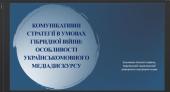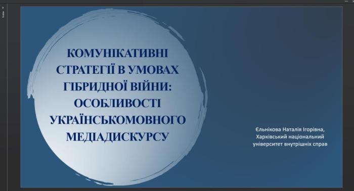 Старша викладачка Наталія ЄЛЬНІКОВА підготувала доповідь «Комунікативні стратегії в умовах гібридної війни: особливості українськомовного медіадискурсу», у якій зазначила, що виникнення нових інструментів і платформ, які застосовують як для поширення правдивої інформації, так і для дезінформації та маніпуляцій, зумовило дослідження особливостей функціонування медіа в умовах гібридної війни. За таких обставин дослідження комунікативних стратегій є запорукою забезпечення інформаційної безпеки країни. Ефективна протидія комунікативним стратегіям гібридної війни потребує комплексного підходу, який містить розвиток критичного мислення, медіаграмотність, створення незалежних медіа, а також міжнародне співробітництво у сфері інформаційної безпеки.
