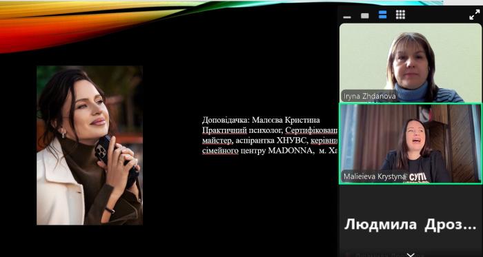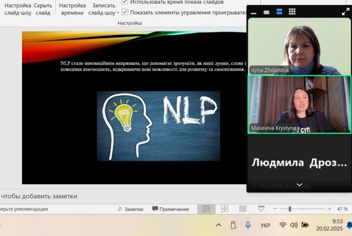Доцентки кафедри соціології та психології ННІ №5 Ірина ЖДАНОВА та Олена ШАХОВА провели бінарне заняття з дисциплін «Психологія здоров’я» і «Психотерапія та психокорекція» для здобувачів вищої освіти першого рівня навчання на тему «Сучасні психологічні практики в контексті охорони здоров’я». До проведення заняття була запрошена практична психологиня, сертифікована майстриня з нейролінгвістичного програмування (НЛП), керівниця сімейного центру MADONNA Кристина МАЛЄЄВА. Під час онлайн-зустрічі вона ознайомила молодь із основними поняттями та принципами НЛП, такими як розуміння моделей поведінки, вербальних і невербальних сигналів, а також методами, які дозволяють впливати на поведінку, мислення та емоції людини. Здобувачі освіти також засвоїли деякі практики та дізналися про особливості використання НЛП з профілактичною та терапевтичною метою.