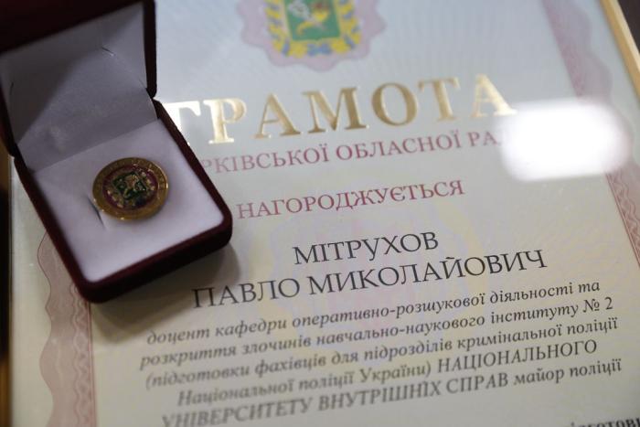 За високий професіоналізм, значні успіхи у підготовці висококваліфікованих кадрів, сумлінне та бездоганне служіння народові України Грамотою Харківської обласної ради було нагороджено доцента кафедри оперативно-розшукової діяльності та розкриття злочинів навчально-наукового інституту №2 ПАВЛА МІТРУХОВА.