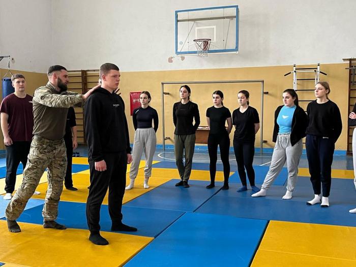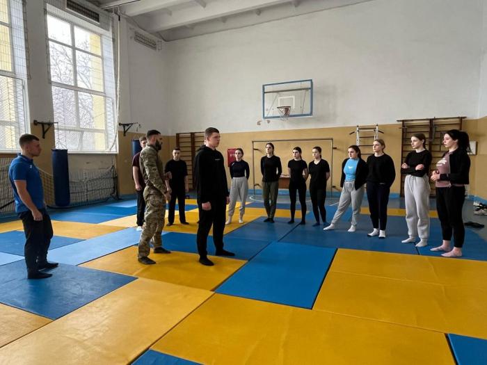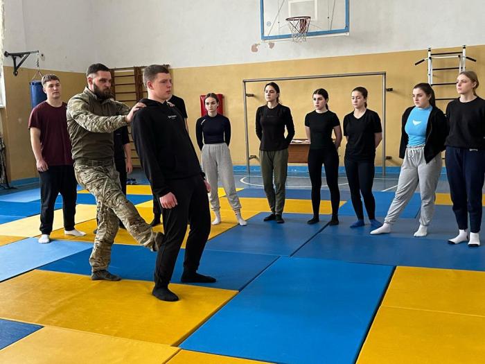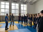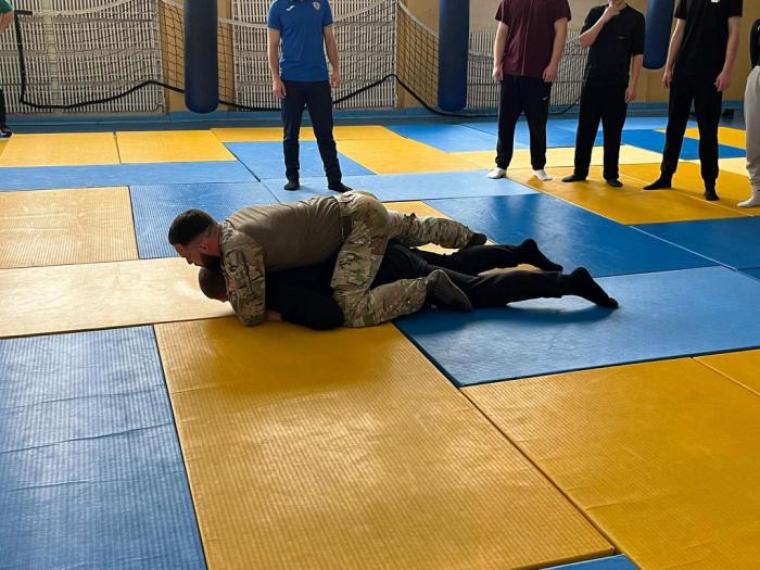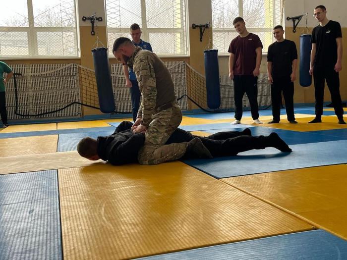 Вони детально розібрали з курсантами способи затримання під час підходу ззаду із загинанням руки за спину, дотисканням кисті та удушенням.