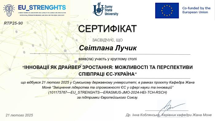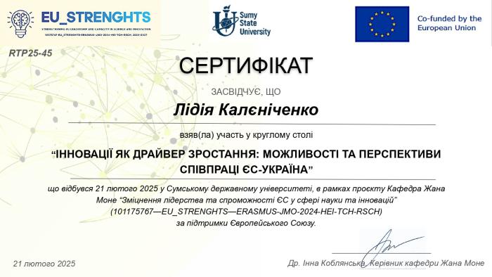 Науково-педагогічні працівники кафедри інформаційних систем та технологій ННІ №4 – завідувачка Лідія КАЛЄНІЧЕНКО, професорка Світлана ЛУЧИК та викладачка Ірина ДОВГАНЬ долучилися до роботи круглого столу «Інновації як драйвер зростання: можливості та перспективи співпраці ЄС – Україна». Мета заходу – налагодження діалогу та співпраці між науковцями, владою, громадянським суспільством щодо розвитку інновацій в Україні, інтеграції в інноваційні системи ЄС.