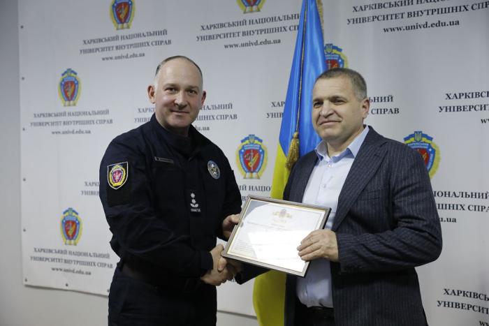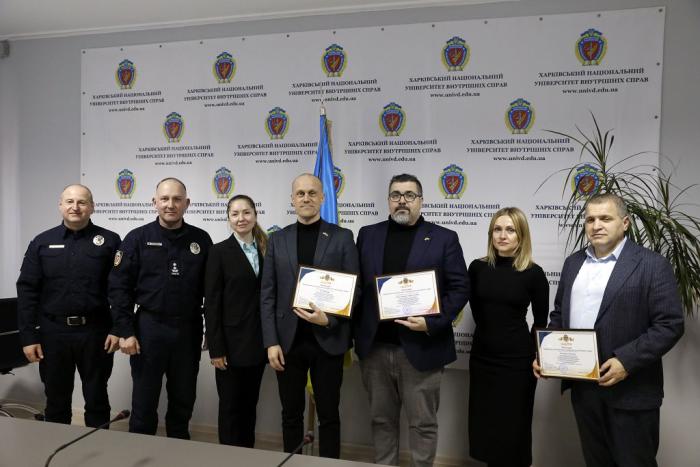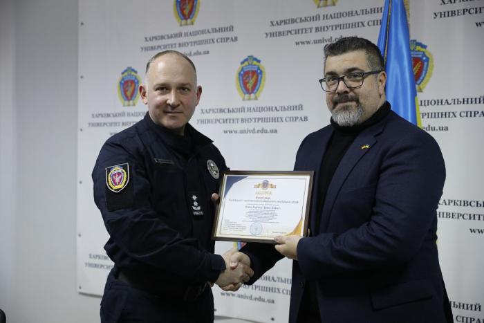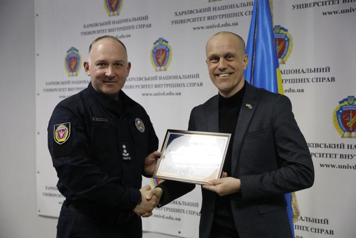 Відзначаючи вагомий внесок іноземних партнерів у навчання правоохоронних кадрів України, високий професіоналізм, особисту ініціативність і творчий підхід до проведення тренінгового курсу, перший проректор вручив Подяку Вченої ради ХНУВС старшим радникам з питань OSINT Хуану Карлосу АДРІАСУ ЛОПЕСУ і Тео МАНДОКІ, а також експерту з питань кримінальних розслідувань Василю БОДНАРЮКУ.