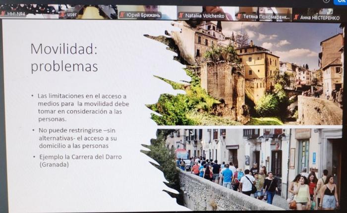 Під час онлайн-презентації Марк ТАРРЕС розкрив сутність поняття «міська мобільність», відзначивши відсутність його нормативного визначення в нормативно-правовому полі Іспанії; окреслив основні фактори, які вплинули на виникнення і розвиток поняття «міська мобільність» (розвиток міст, транспортної системи, залучення технологій тощо); висвітлив основні цілі розвитку міської мобільності (безпека, доступність, стійкий розвиток); визначив основні проблеми, пов’язані із розвитком міської мобільності (невідповідність якості повітря та звукового фону).