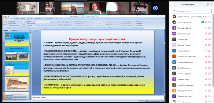 Заступниця директорки Елла ТВЕРДОХЛІБ презентувала Харківський національний університет внутрішніх справ, розповіла про умови вступу, навчально-наукові інститути та спеціальності, за якими готують фахівців. Вона ознайомила з роботою підготовчого відділення, а також запропонувала усім майбутнім абітурієнтам, які виявили зацікавленість у вступі до ХНУВС, доєднатися до телеграм-каналу інституту для подальшої співпраці.