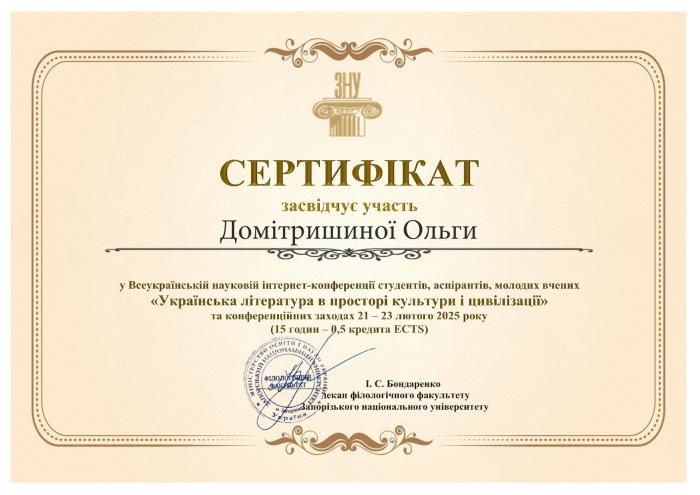 Доцентка кафедри гуманітарних дисциплін та українознавства, кандидатка філологічних наук Наталія КОБИЛКО та студентка ННІ №5 Ольга ДОМІТРИШИНА взяли участь у Всеукраїнській науковій інтернет-конференції студентів, аспірантів і молодих вчених «Українська література в просторі культури і цивілізації», організатором якої виступив Запорізький національний університет. Учасники заходу спілкувалися у віртуальному просторі – на сторінці конференції, де обговорювали доповіді, ставили запитання, дискутували.